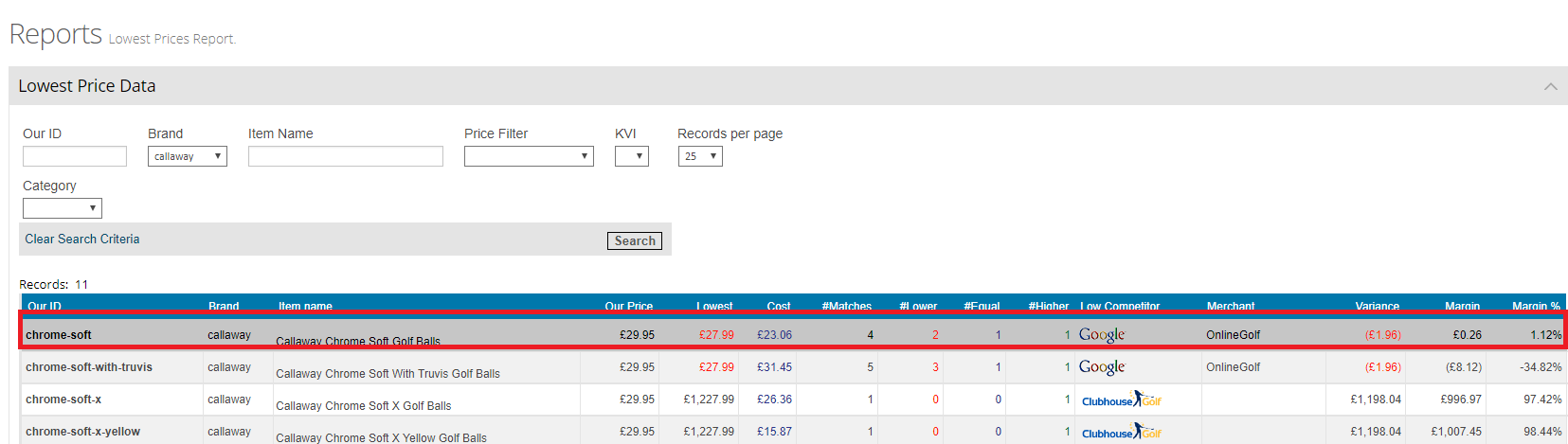 The lowest prices report shows the lowest market prices for each of your products and includes the lowest retailer, the number of matches and how many are lower, equal and higher than your prices. This is commonly used for identifying products where you are not as competitive with your price. Together with the built in profit margin, you can quickly make cost effective amendments.